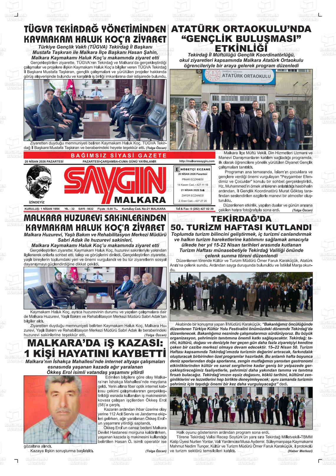 Tekİrdağ Yerel Gazeteleri 20 Nisan 2026, Pazartesi Günü Manşeti